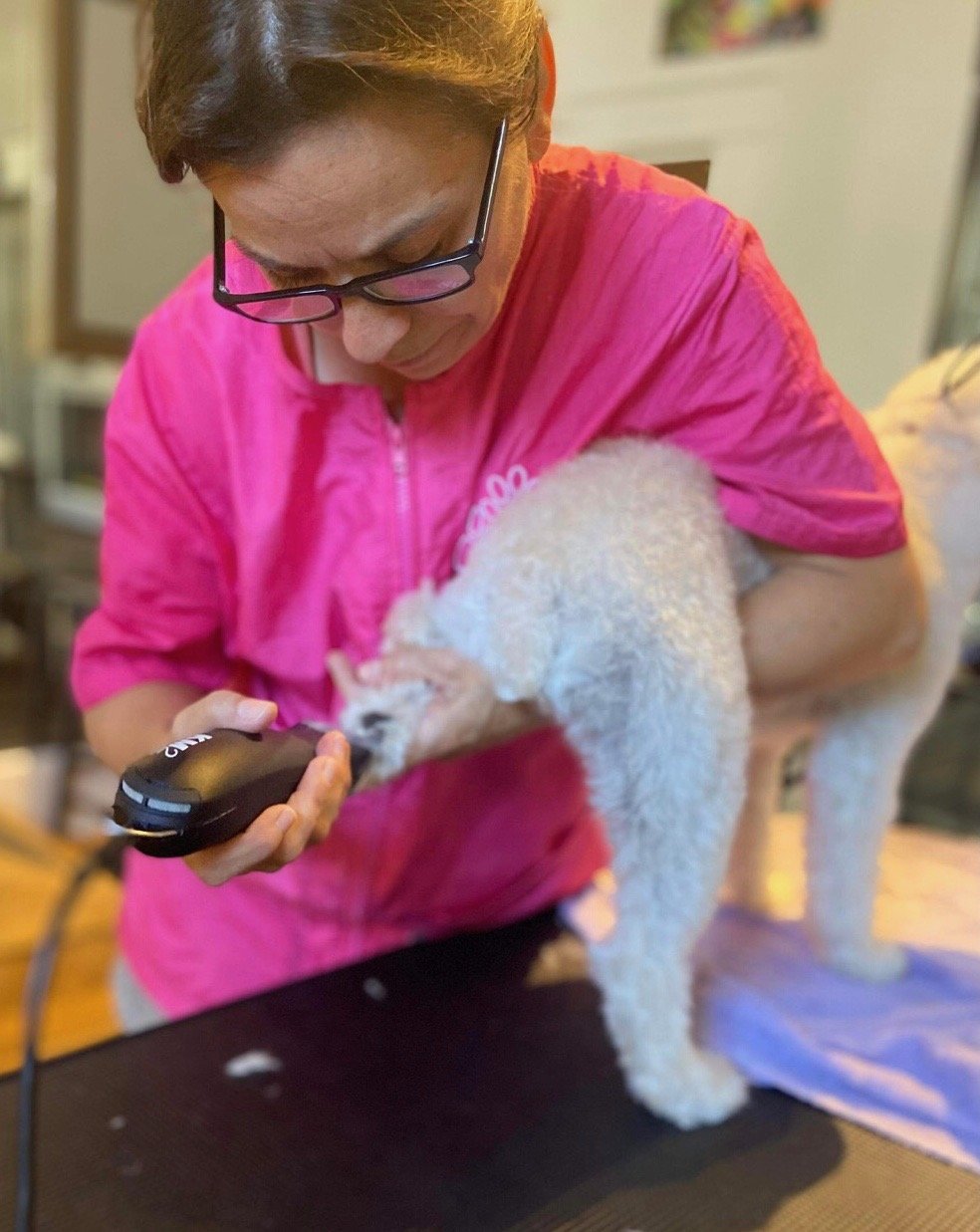 Appropriate shampoo and conditioner, nail trim and grind with any minor tidy up.